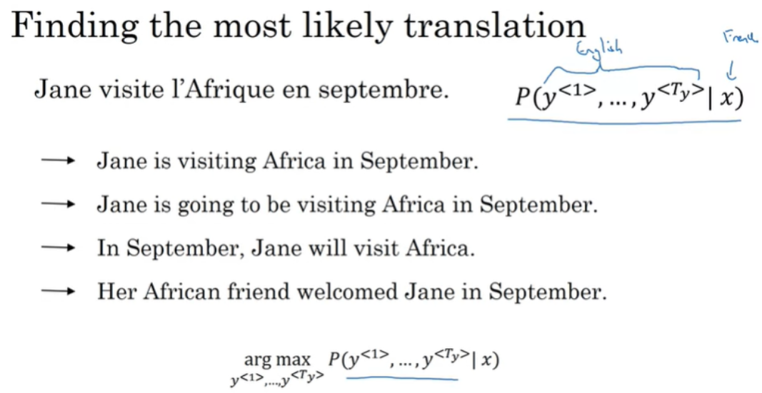 결국 우리가 위 모델을 통해서 프랑스어 문장을 영어로 번역하려면, 가장 높은 확률의 번역( $ P(y^{<1>}, \cdots, y^{<T_{y}>} | x ) $ ) 을 찾아야 한다.
