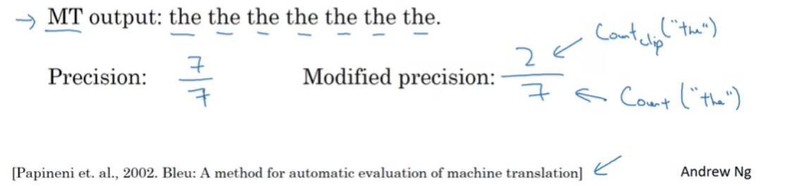 Bleu Score는 직관적으로 기계가 생성하는 글의 유형을 최소한 인간이 만들어낸 reference에서 나타나는지 살펴보는 방법이다. 극단적인 기계번역(MT)의 결과를 가지고 어떻게 점수가 계산되는지 살펴보자.