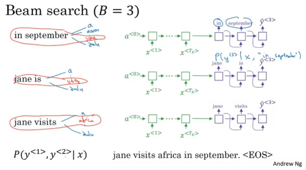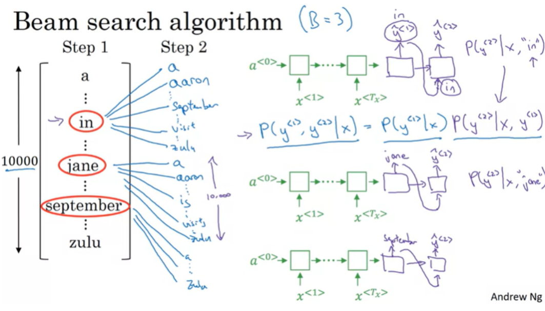 그래서 Step 1에서 가장 확률($ P(y^{<1>} | x ) $)이 높은 단어 3개 'in', 'jane', 'september'를 선택하게 된다.