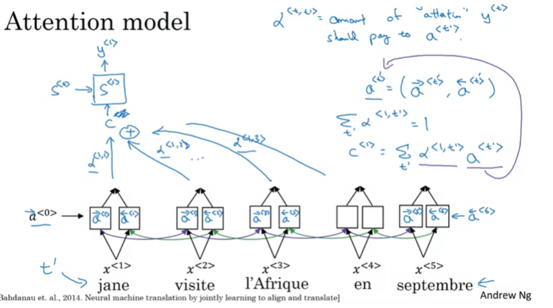 간략하게 위 내용을 설명하면, BRNN(Encoder)을 통해서 계산된 activation을 사용해서 C를 구하는데, 이때 일부 activation만 참조한다. 그리고, C를 Decoder의 입력으로 사용해서 단어를 예측한다. C를 계산하는 방법은 잠시 후에 설명하도록 한다.