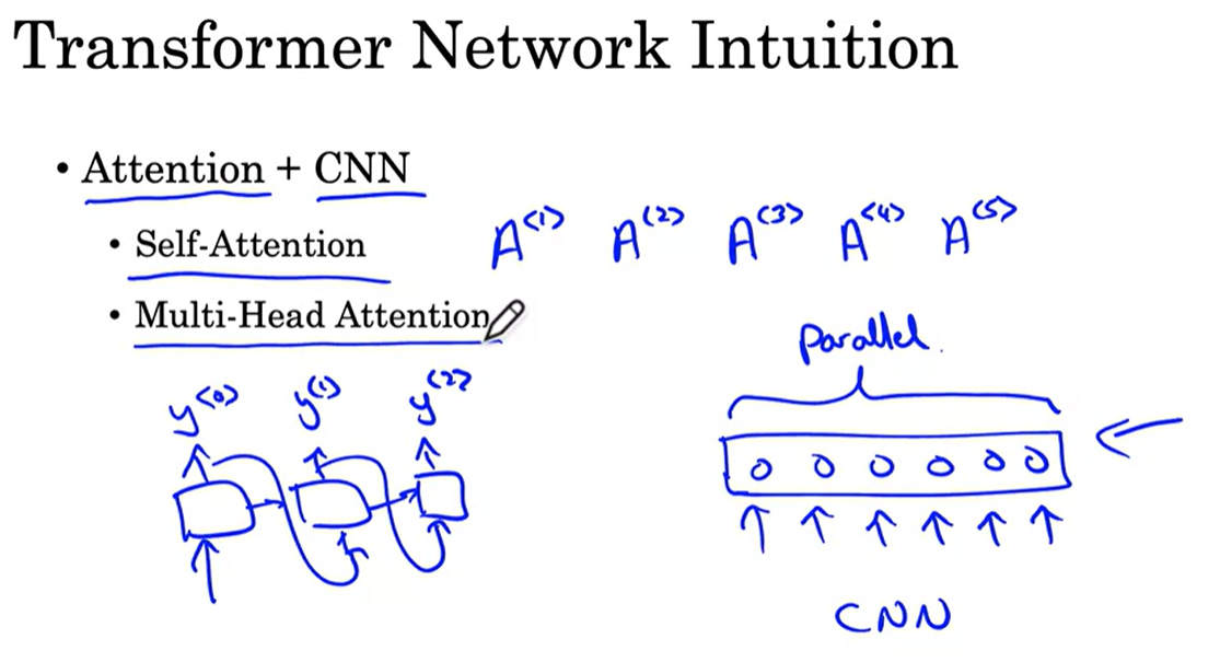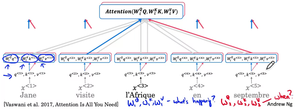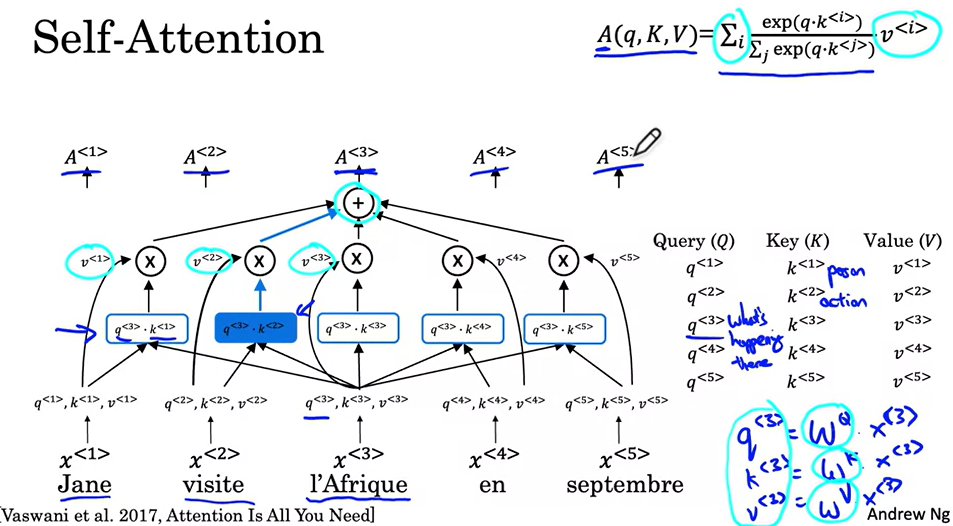 이게 바로 $ A^{<3>} $ 가 하는 일로, 맥락을 보고 가장 적절한 표현을 찾는 것이다. 실제 계산은 RNN의 어텐션 모델과 유사하다.