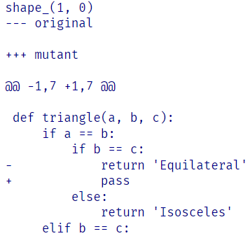 generate_mutant() 메서드는 단순히 mutator() 메서드를 호출하고, 변형기에게 AST 복사본을 전달한다. src() 메서드는 변형된 소스를 반환한다. diff() 메서드는 변형을 원본과의 차이로 시각화한다.
