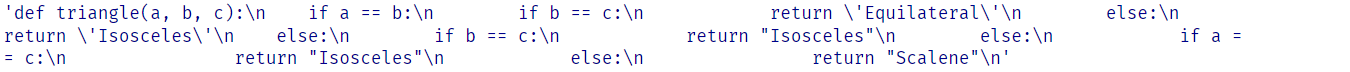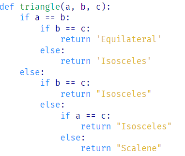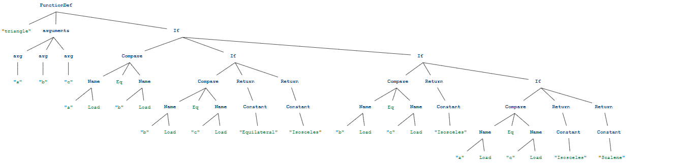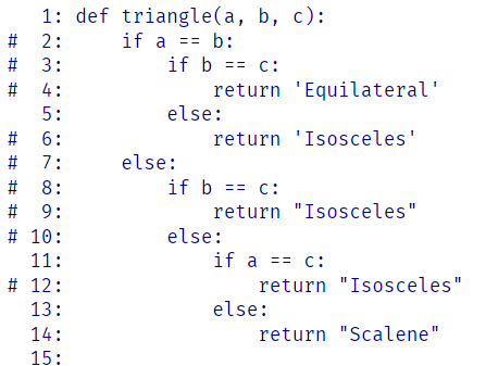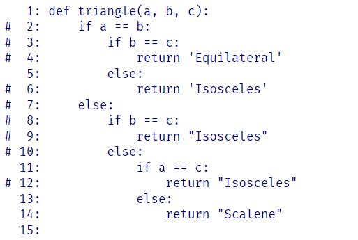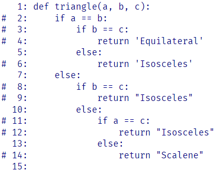 커버리지의 문제점과 변이 분석이 어떻게 작동하는지를 설명하기 위해 더 자세한 예시를 소개하겠다. 아래의 triangle() 프로그램은 변의 길이가 a, b, c인 삼각형을 적절한 삼각형 분류로 분류합니다. 우리는 이 프로그램이 올바르게 작동하는지 확인하고자 한다.