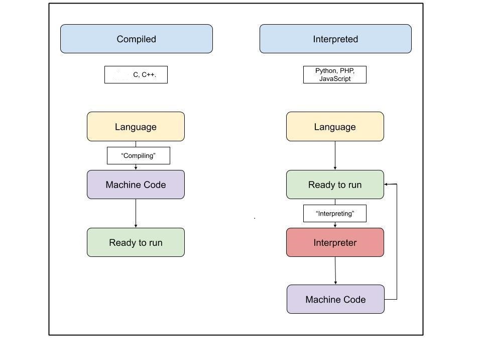 - 컴파일러는 소스코드 전체를 컴퓨터 프로세서가 실행할 수 있도록 바로 기계어로 변환한다. 인터프리터는 고레벨 언어를 중간 코드(intermediate code)로 변환하고 이를 각 행마다 실행한다.