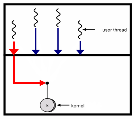 - 하나의 User Thread가 Block되면 모든 스레드가 멈춤.