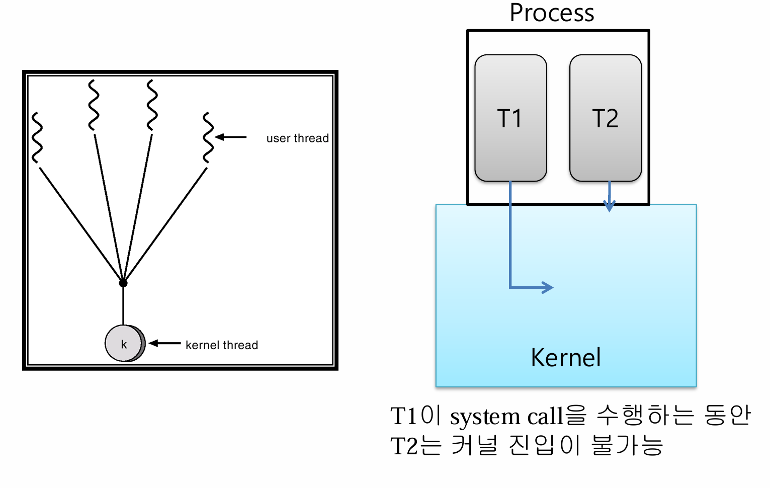 - Many-to-One은 Kernel Thread를 지원하지 않는 시스템에서 사용.