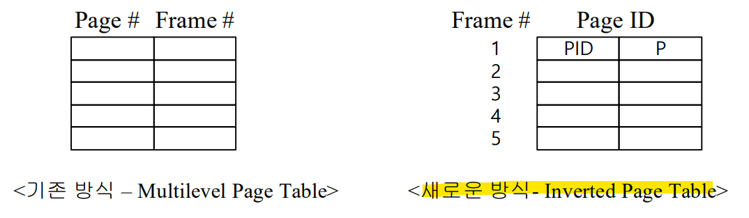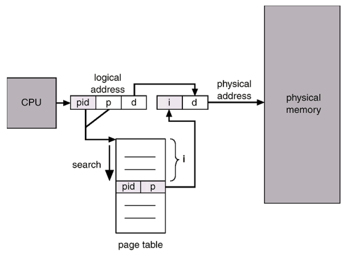 - Inverted Page Table 은 CPU 에서 참조하는 Address 와 PID 조합으로 Page ID 를 만들어 Page Table 내에서 Page ID 를 검색함