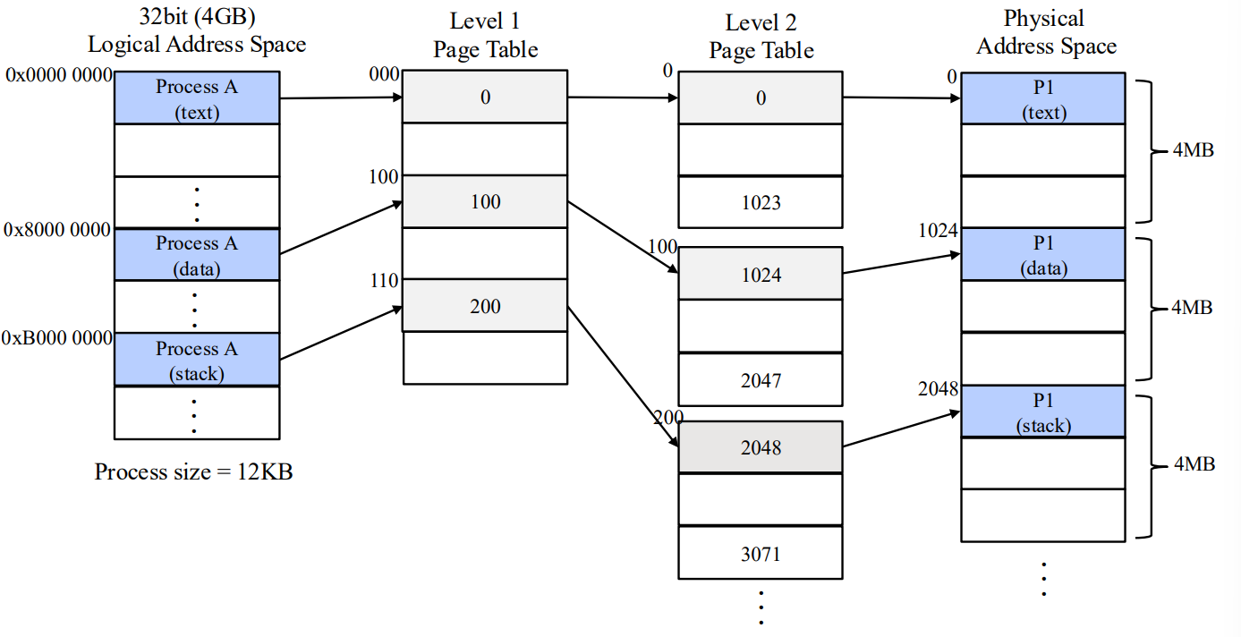 ex) 앞서의 예에서, 20 Bit 를 차지하는 Page 번호를 다시 아래와 같이 나눈다.- 10 Bit Page 번호