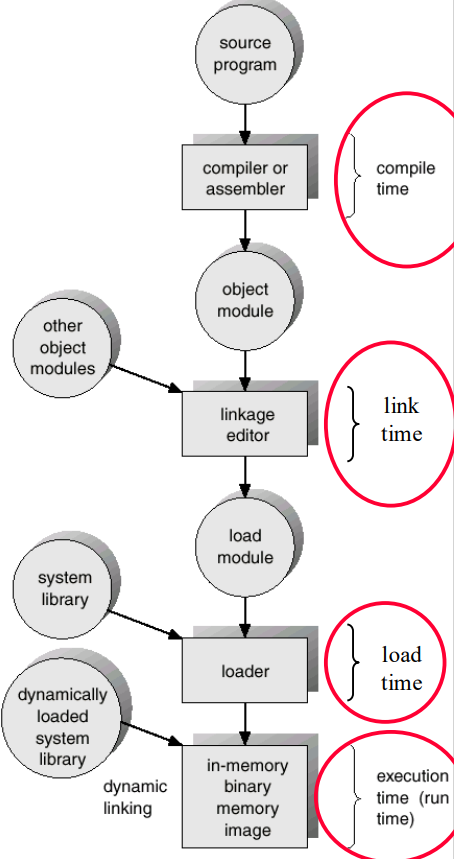 - 나중에 배울 Paging 이나 Swapping 을 통해서 Process 가 올려지는 Memory 의 물리 주소는 바뀔 수 있다.