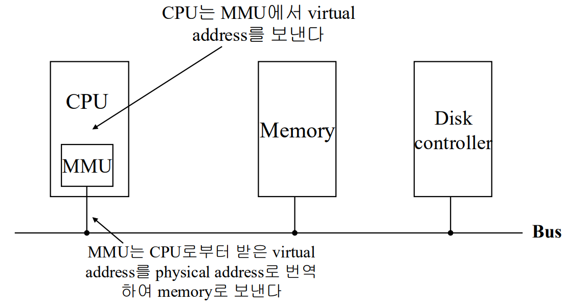 - CPU가 명령어 실행 시 가상 주소를 생성하면, MMU가 이를 실제 물리 주소로 변환해 메모리에 접근.