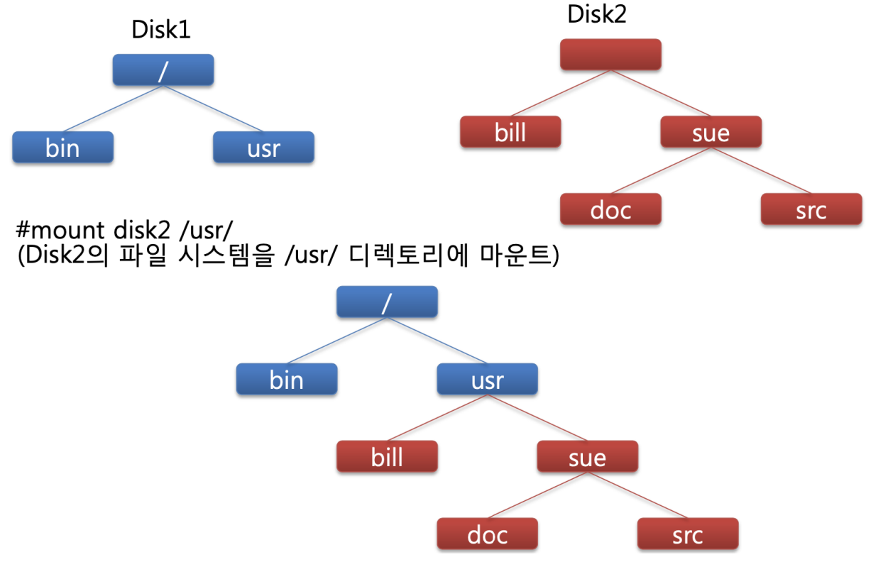 ex) /home 디렉토리에 /a/b/c 디렉토리를 마운트하면 /home/a/b/c 경로를 통해 접근 가능.