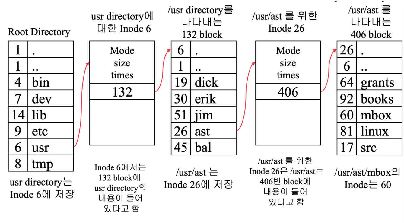 - /usr/ast는 I-node 26을 참조하며, 이는 /usr/ast의 데이터 블록에 저장된 내용을 가리킨다.