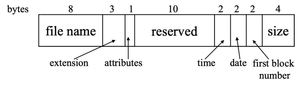 - 파일 이름(8 bytes)과 확장자(3 bytes), 속성, 크기, 데이터 블록 번호 등으로 구성.