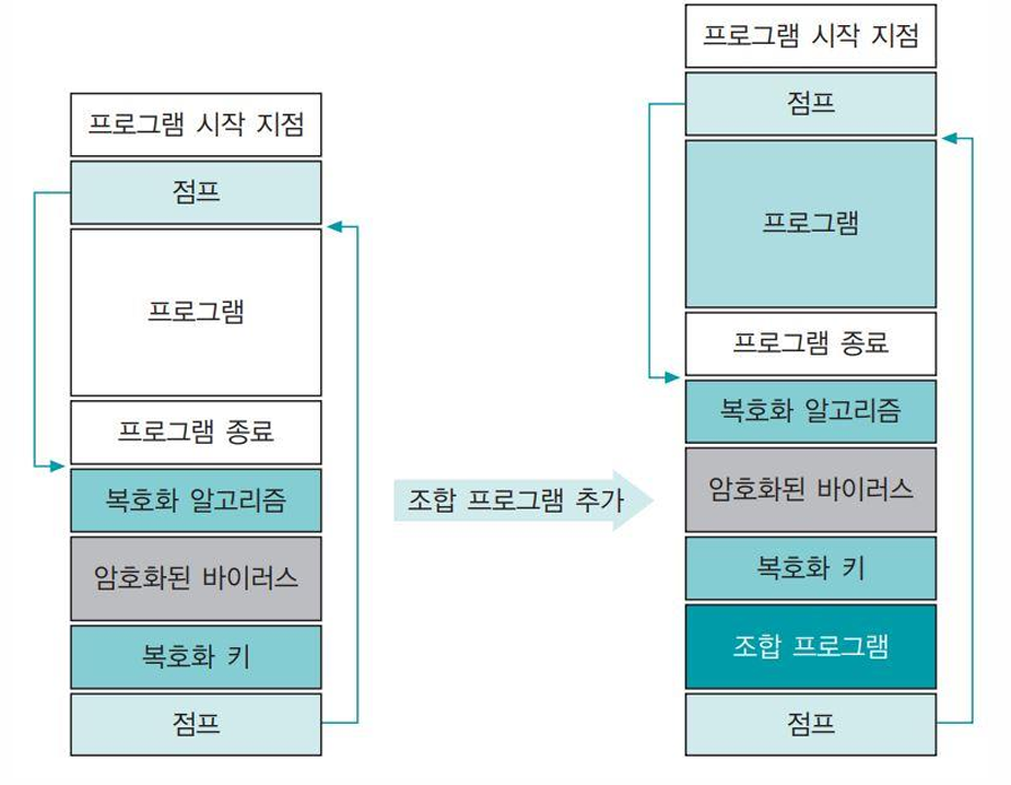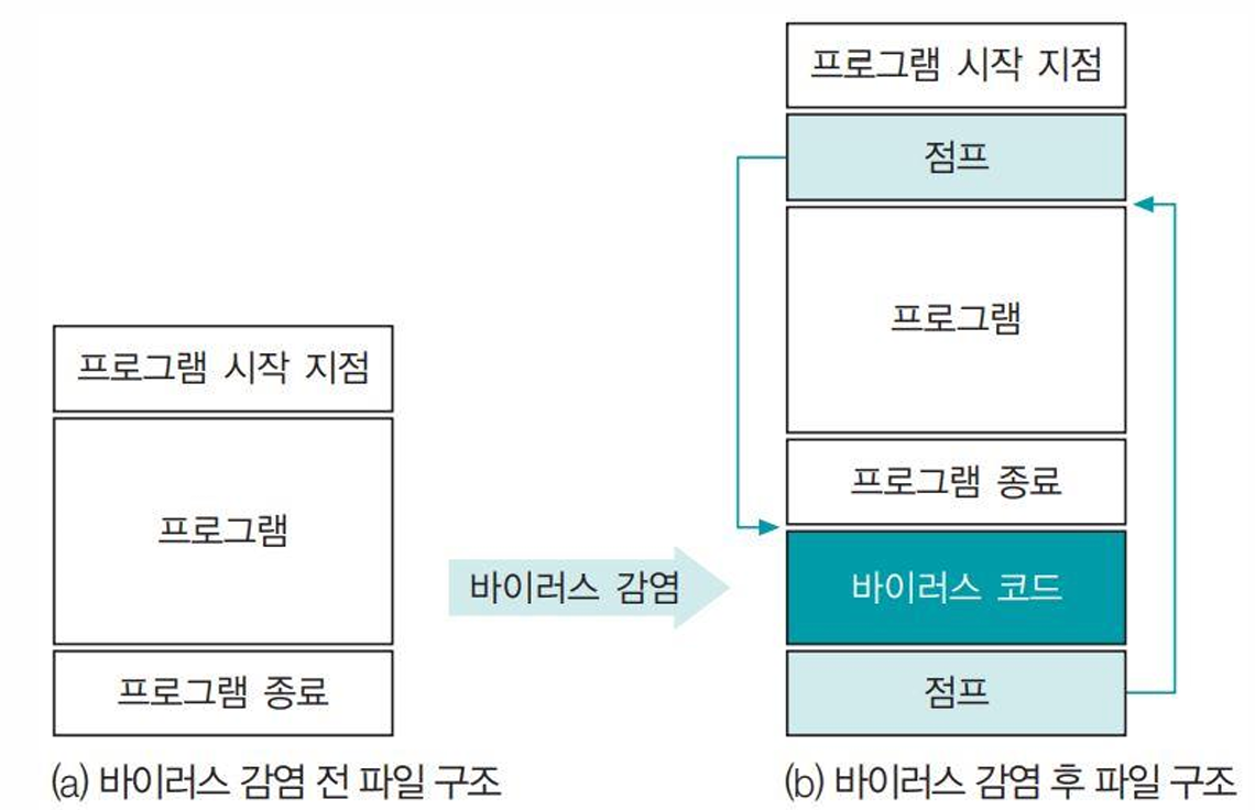 +-------------------+ | 바이러스 서명 (1234567) | +-------------------+ | 바이러스 코드 (V) | +-------------------+ | 원래 프로그램 코드 | +-------------------+