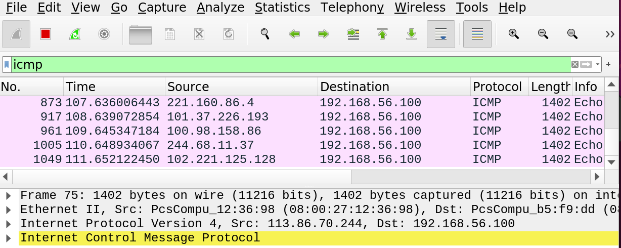 - sudo hping3 --icmp --rand-source 192.168.56.100 -d 65000
