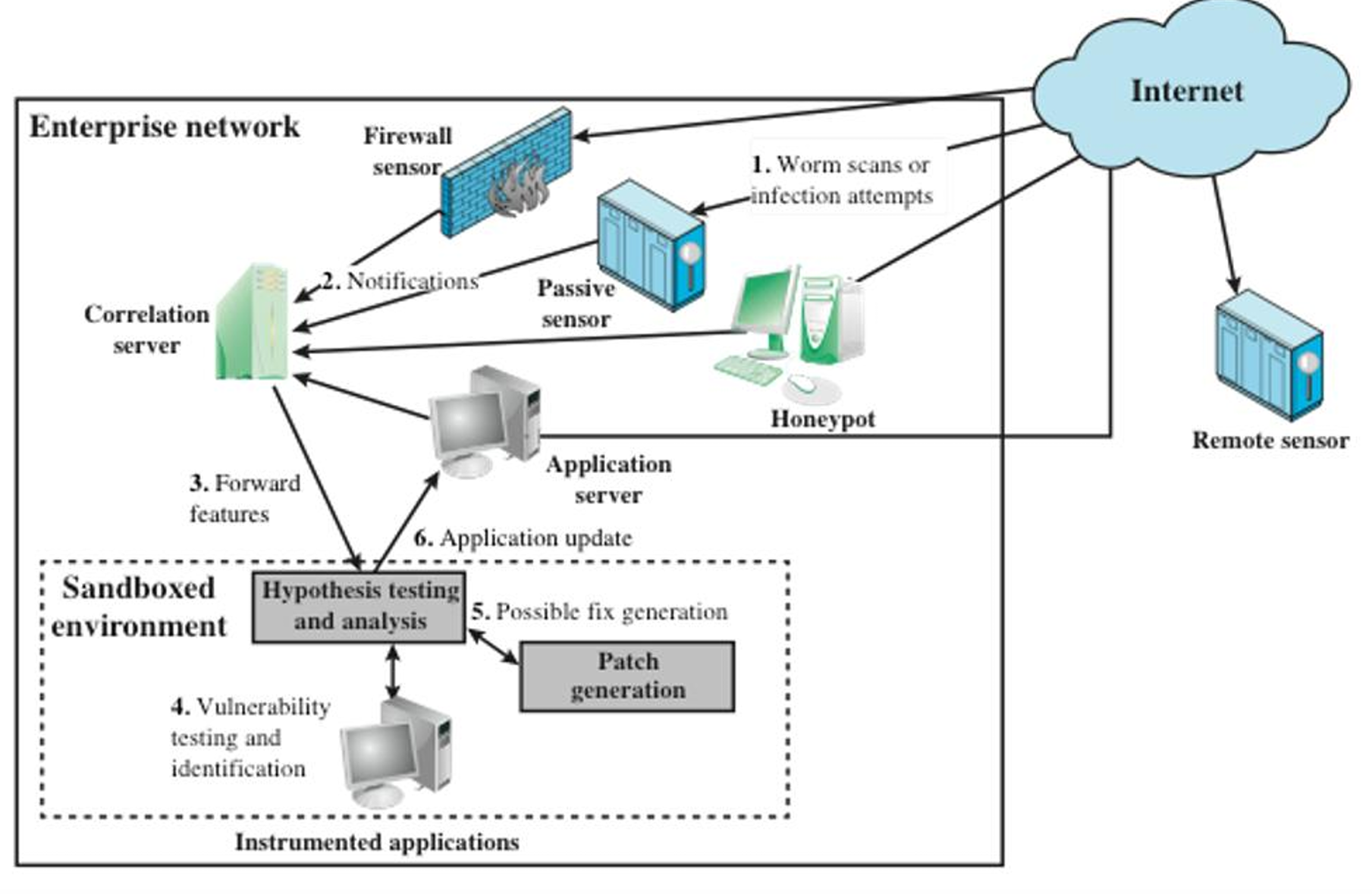 - 1단계: 네트워크 상의 다양한 위치에 놓인 센서 (Firewall sensor, Passive sensor) 가 웜을 탐지
