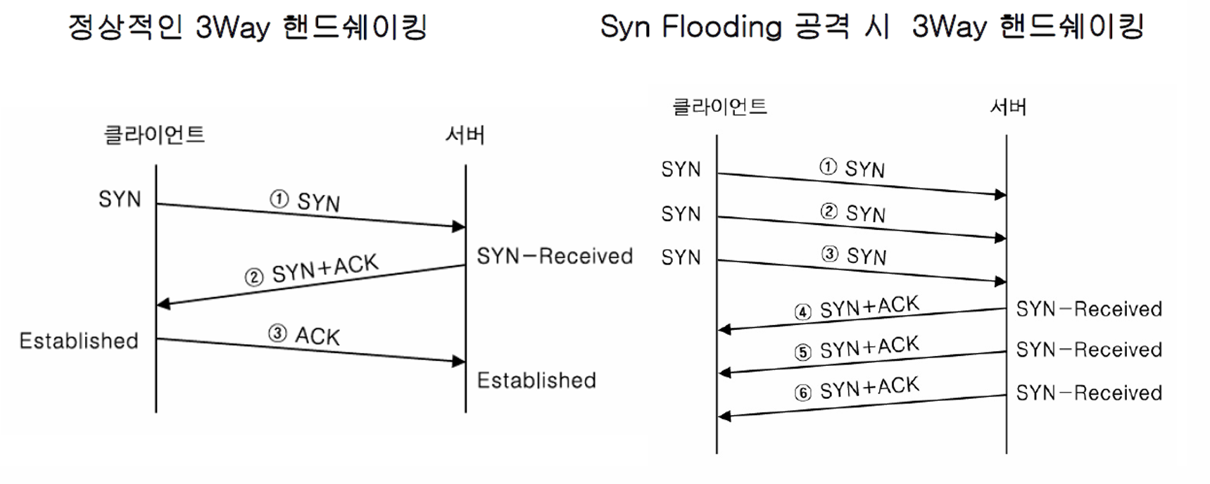 - 공격자는 많은 숫자의 SYN 패킷을 서버에 보냄