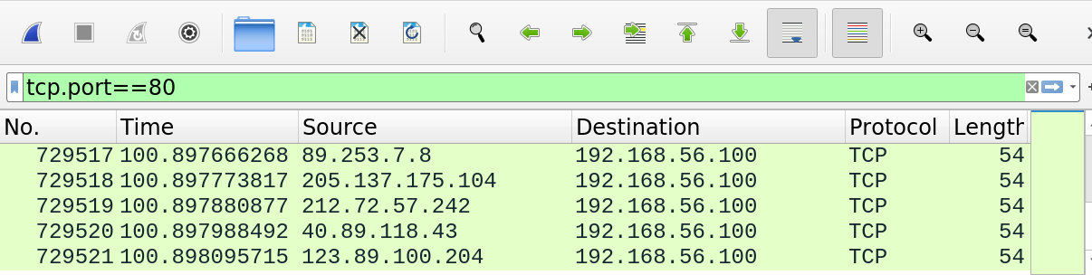 - $sudo hping3 --rand-source 192.168.56.1 -p 80 -S