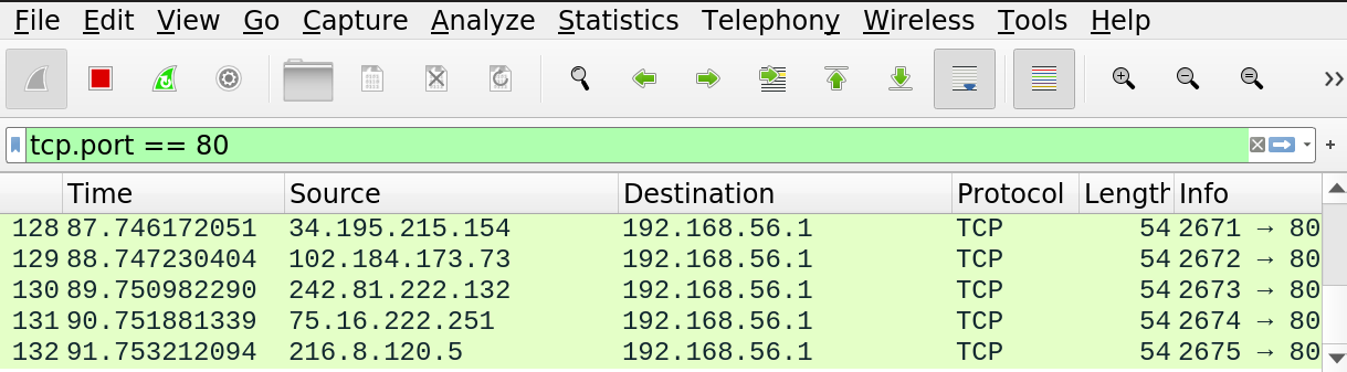 - $sudo hping3 --rand-source 192.168.56.1 -p 80 -S