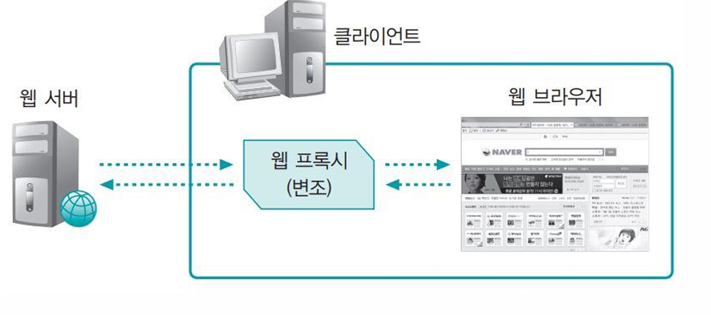 - 클라이언트가 웹 서버와 웹 브라우저 간에 전달되는 모든 HTTP 패킷을 웹 프록시를 통해 확인하면서 수정 가능