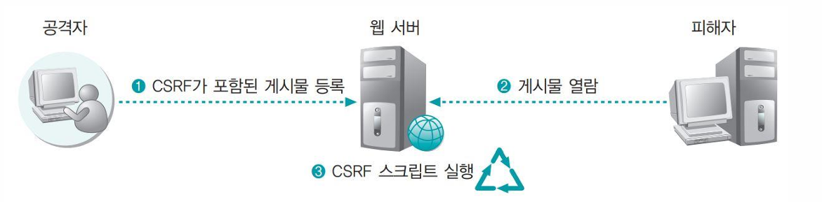- 사용자가 자신의 의지와 무관하게 공격자가 의도한 행위 (수정, 삭제, 등록, 송금 등) 를 하게 만드는 공격
