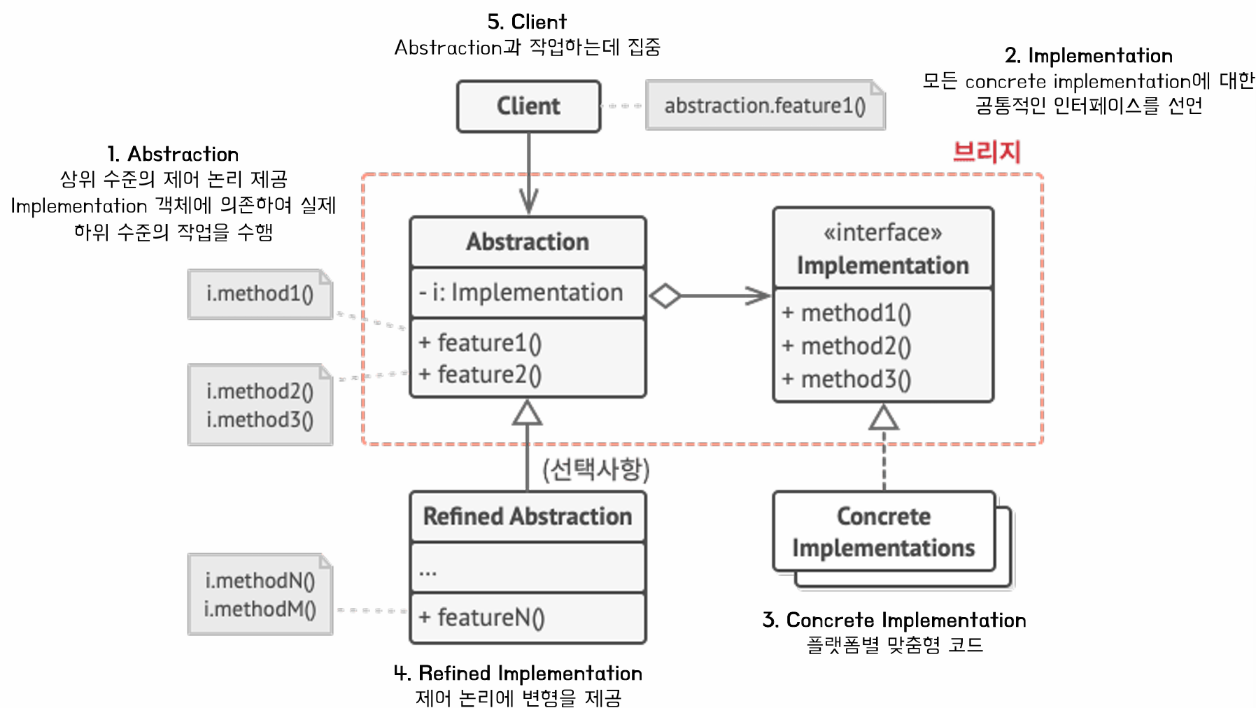 - Abstraction 과 Implementation 을 분리하고 브릿지로 연결하여 변화 대응에 독립적으로 확장될 수 있음