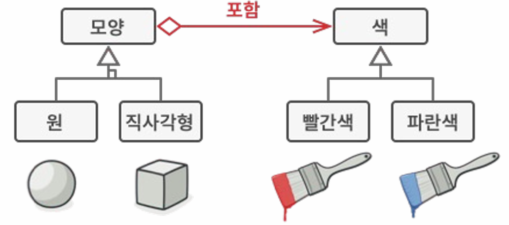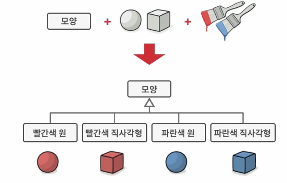 - Shape 과 Color 의 조합을 가지는 클래스 구성에서는 새로운 모양과 색상 유형이 추가될 때마다 계층 구조는 기하급수적으로 늘어남