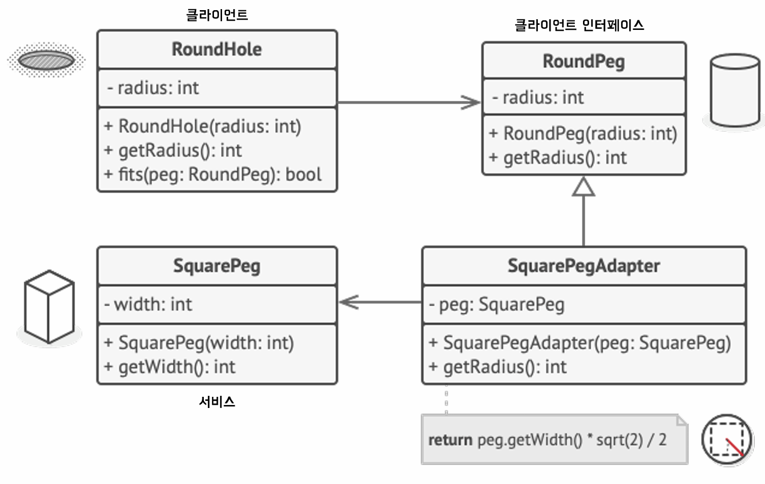 // 둥근 구멍 class RoundHole { private int radius; public RoundHole(int radius) { this.radius = radius; } public int getRadius() { return radius; } public boolean fits(RoundPeg peg) { return peg.getRadius() <= this.radius; } } // 둥근 Peg class RoundPeg { private int radius; public RoundPeg(int radius) { this.radius = radius; } public int getRadius() { return radius; } } // 사각형 Peg class SquarePeg { private int width; public SquarePeg(int width) { this.width = width; } public int getWidth() { return width; } } // 어댑터 class SquarePegAdapter extends RoundPeg { private SquarePeg squarePeg; public SquarePegAdapter(SquarePeg squarePeg) { super(0); // RoundPeg 생성자 호출, 실제 radius는 계산됨 this.squarePeg = squarePeg; } @Override public int getRadius() { return (int) (squarePeg.getWidth() * Math.sqrt(2) / 2); } } // 실행 코드 public class Main { public static void main(String[] args) { RoundHole hole = new RoundHole(5); RoundPeg roundPeg = new RoundPeg(5); System.out.println(hole.fits(roundPeg)); // true SquarePeg smallSquarePeg = new SquarePeg(5); SquarePeg largeSquarePeg = new SquarePeg(10); // 어댑터를 사용 SquarePegAdapter smallSquareAdapter = new SquarePegAdapter(smallSquarePeg); SquarePegAdapter largeSquareAdapter = new SquarePegAdapter(largeSquarePeg); System.out.println(hole.fits(smallSquareAdapter)); // true System.out.println(hole.fits(largeSquareAdapter)); // false } } - 어댑터 패턴 사용 기기