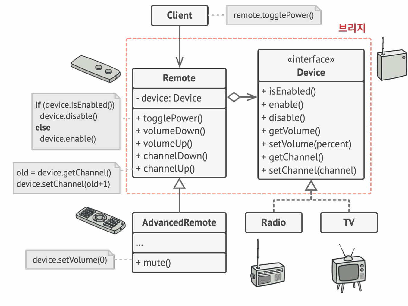 class BasicRemote { protected Device device; public BasicRemote(Device device) { this.device = device; } public void volumeDown(){ int current = device.getVolume(); device.setVolume(current-10); } public void volumeUp(){ int current = device.getVolume(); device.setVolume(current+10); } } // Client public class Client{ public static void testDevice(Device device){ BasicRemote basicRemote = new BasicRemote(device); basicRemote.volumeUp(); basicRemote.volumeDown(); } public static void main(String[] args){ testDevice(new Radio()); testDevice(new TV()); } } - 브릿지 v.s. 어댑터
