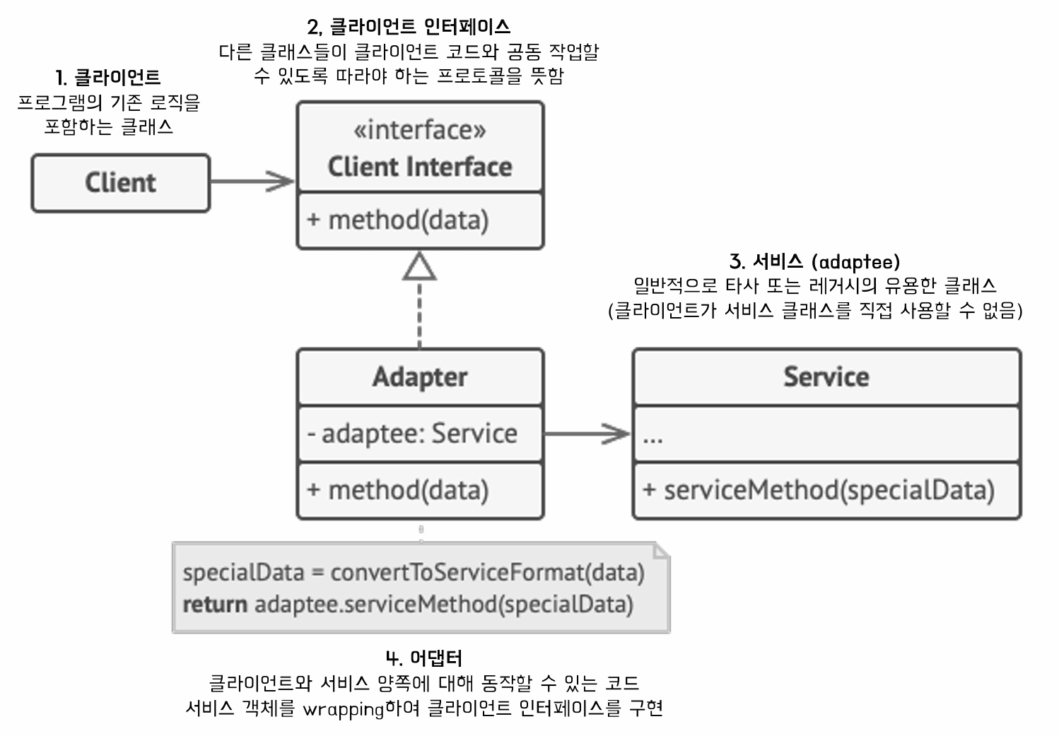 - 호환성이 없는 인터페이스 때문에 함께 동작할 수 없는 클래스들을 어댑터를 통해 함께 작동할 수 있도록 변환해주는 구조 패턴