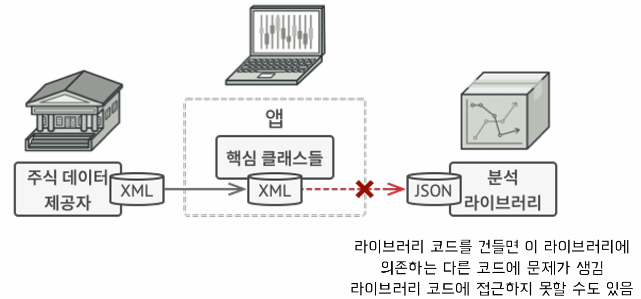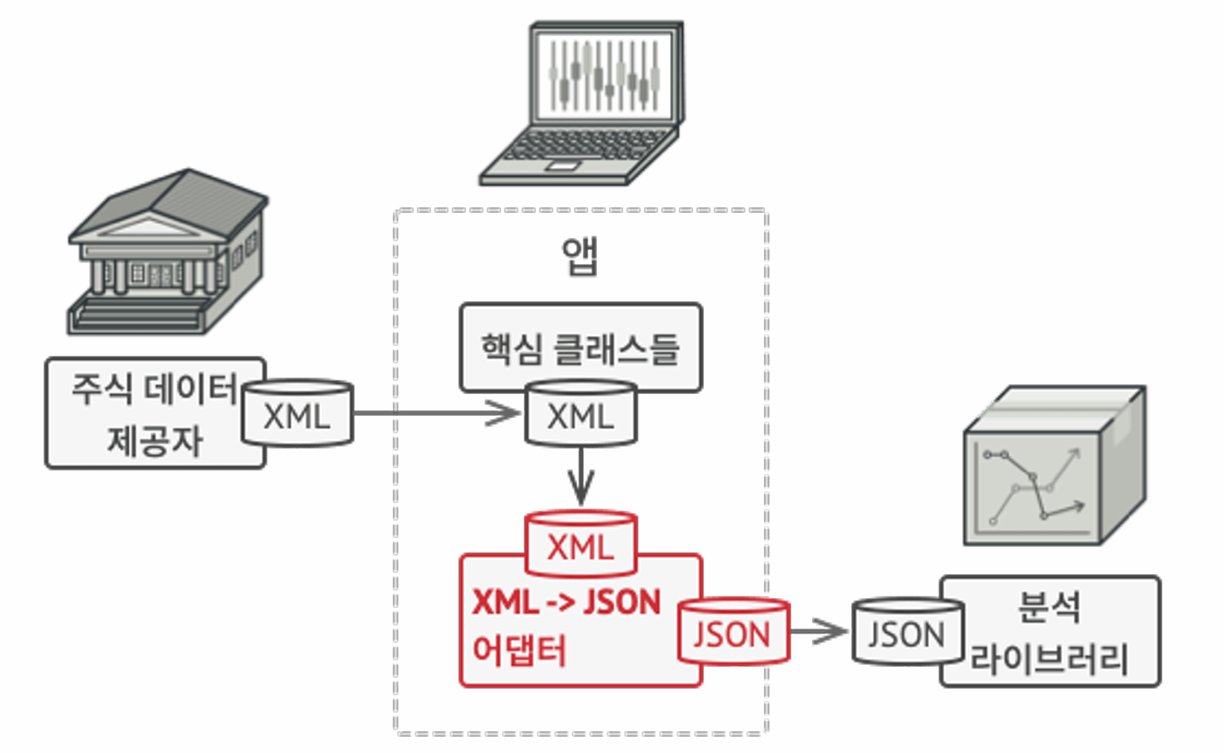 - 이런 경우 XML 에서 JSON 으로 포맷을 변경해주는 어댑터를 만들어주면 서로 연동 가능해짐