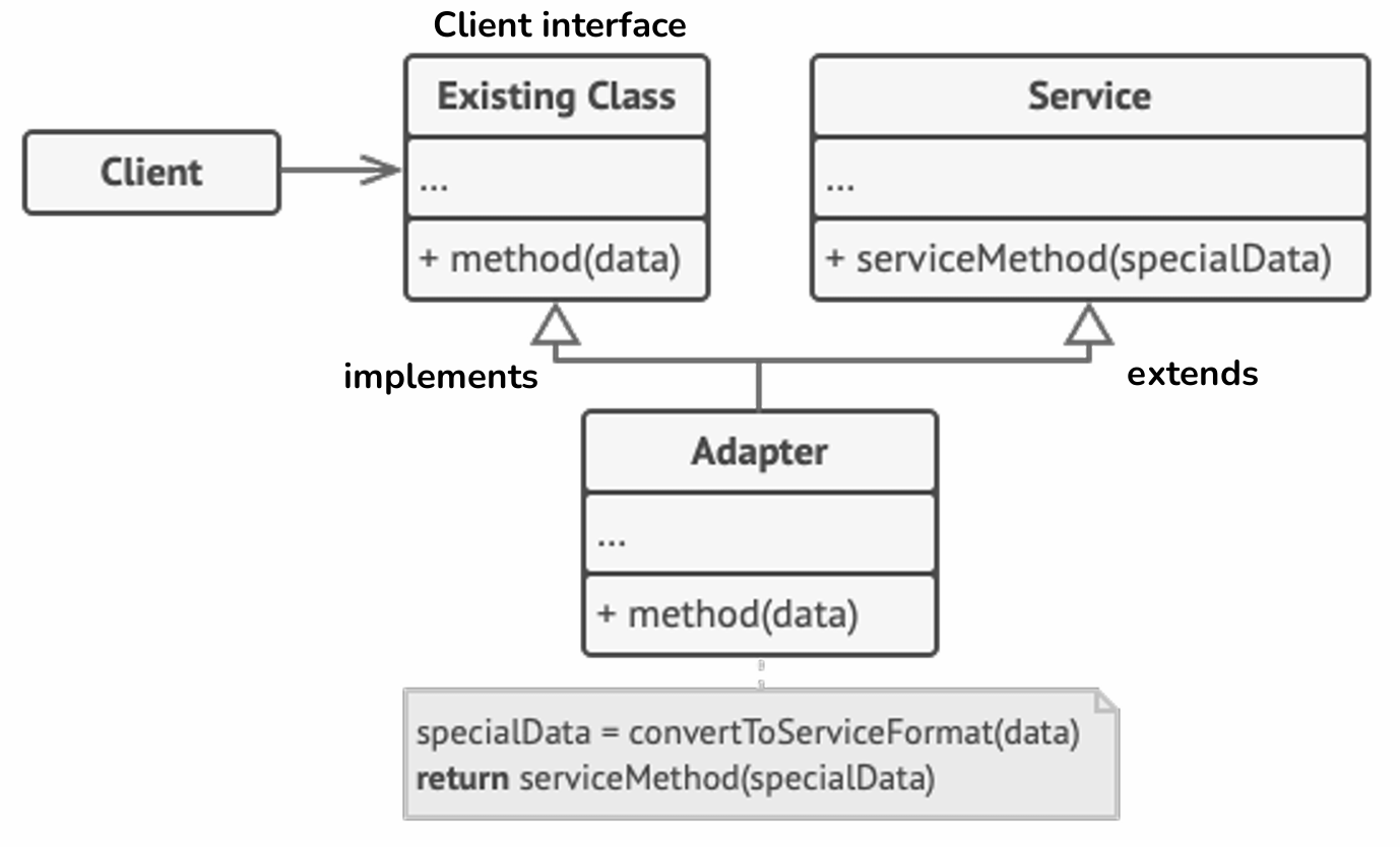 public class Service{ void specificMethod(int specialData){ System.out.println("기존 서비스 기능 호출+ " + specialData); } } public interface Target{ void method(int data); } public class Adapter extends Service implements Target{ @Override public void method(int data){ specificMethod(data); } } public class Client{ public static void main(String[] args){ Target adapter = new Adapter(); adapter.method(1); } } - 어댑터 패턴 예시