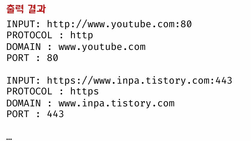 class Client{ public static void main(String[] args){ String url1 = "http://www.youtube.com:80"; System.out.println("INPUT: " + url1); URLParser.run(url1); String url2 = "https://www.inpa.tistory.com:443"; System.out.println("INPUT: " + url2); URLParser.run(url1); String url3 = "http://localhost:8080"; System.out.println("INPUT: " + url3); URLParser.run(url1); } }