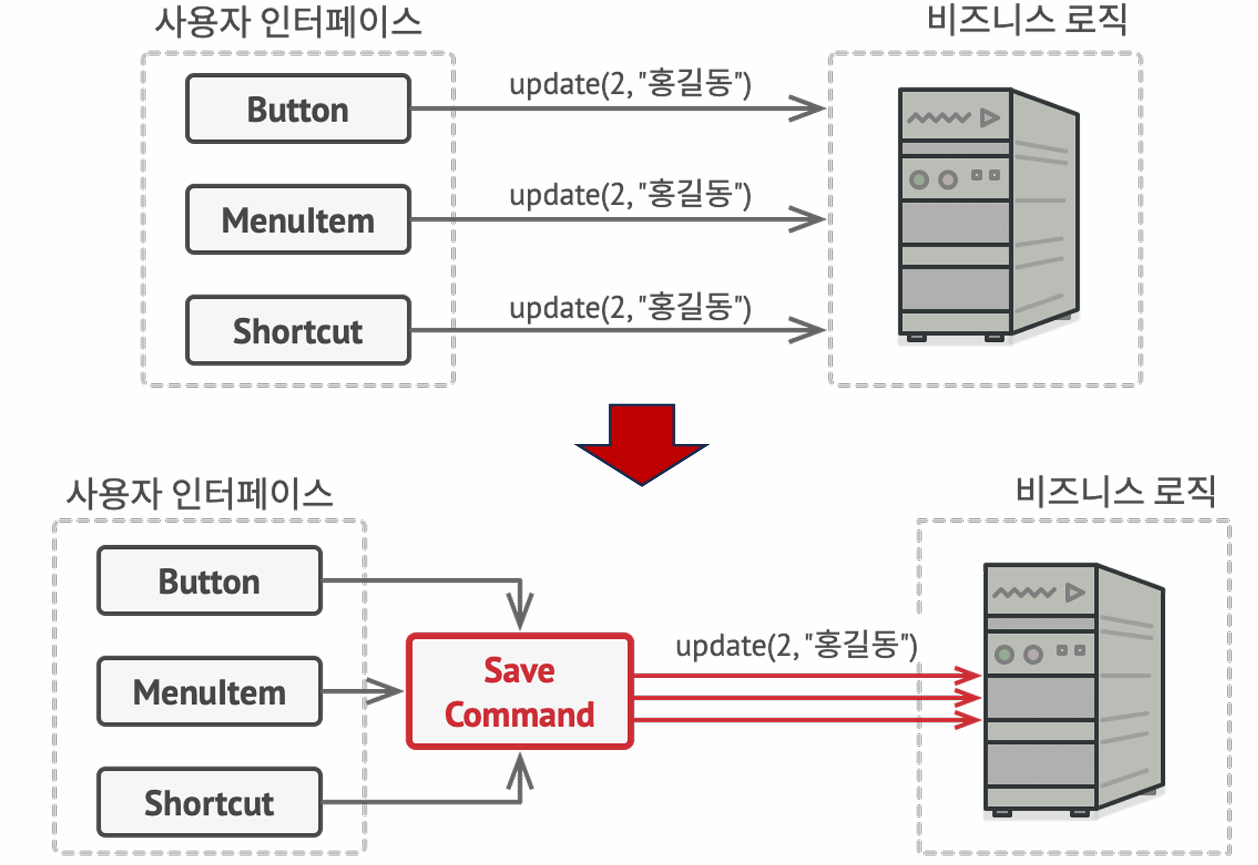 - 인터페이스 객체들이 요청을 직접 보내는 것이 아닌 Command 를 경유해서 보내자.
