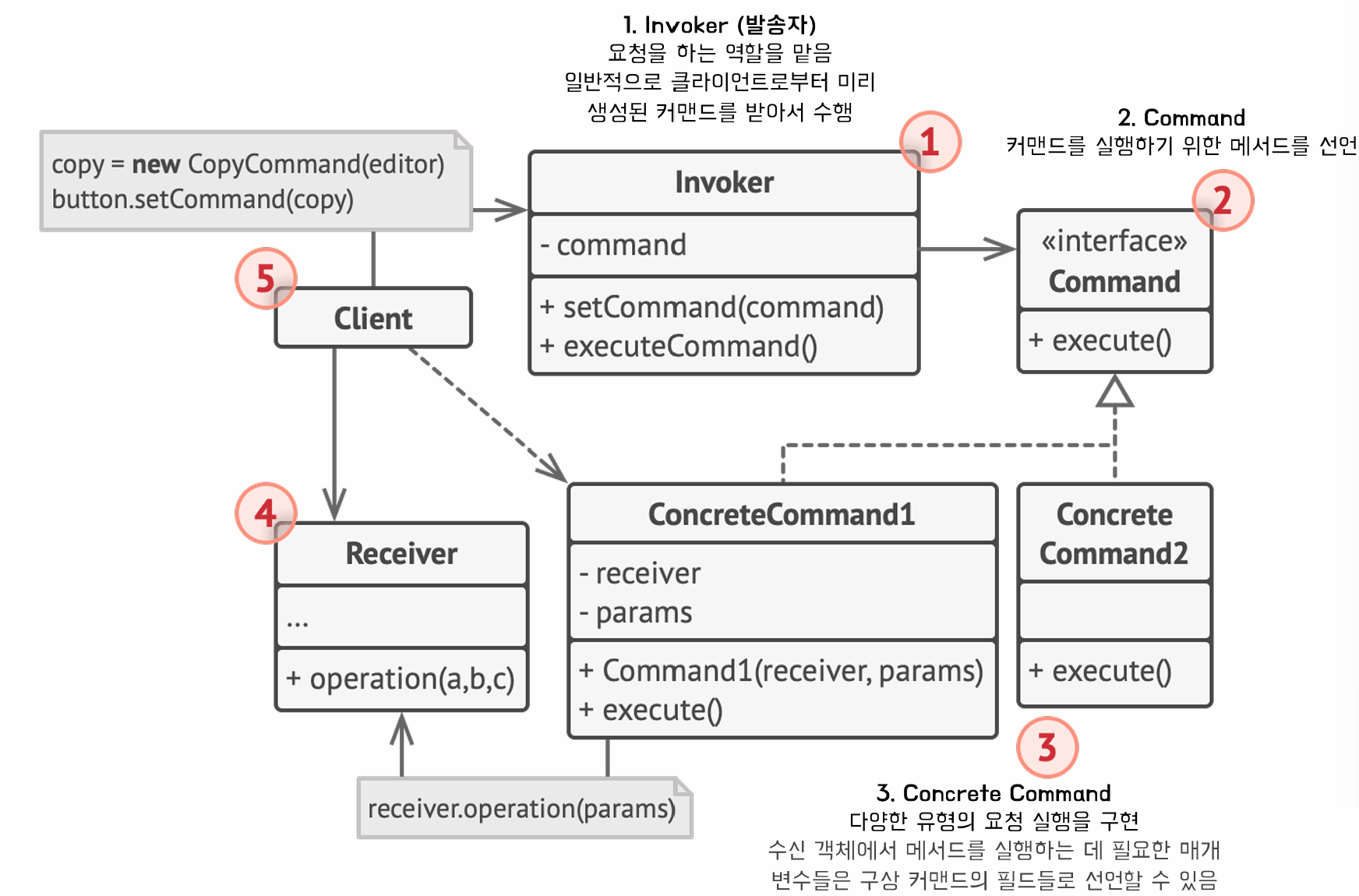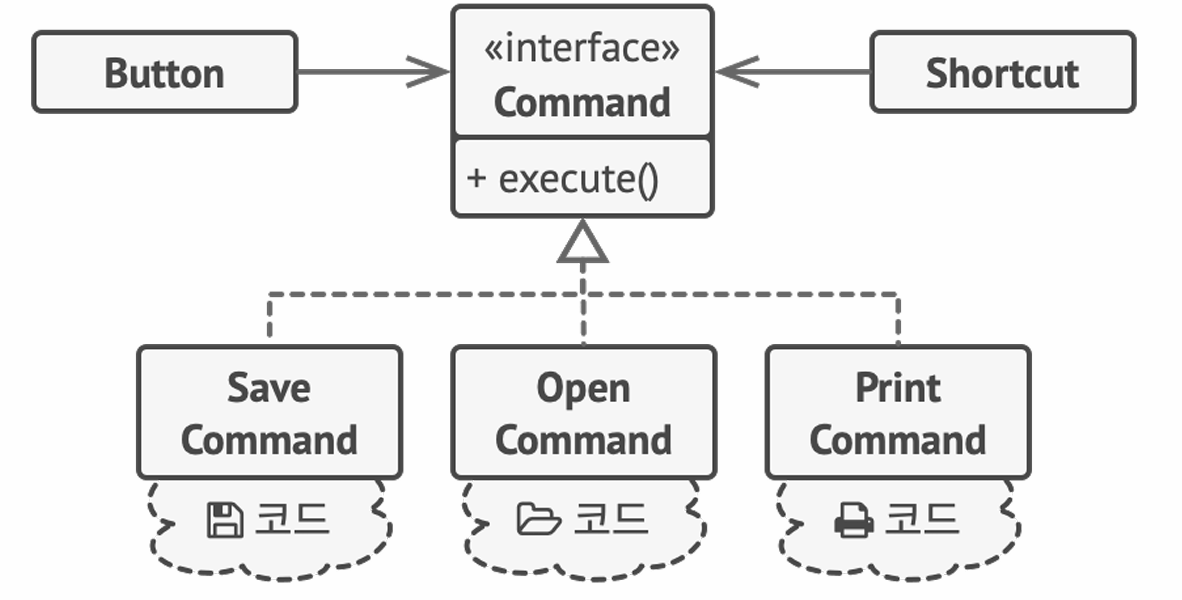 - 요청을 객체의 형태로 캡슐화하여 사용자가 보낸 요청을 나중에 이용할 수 있도록 재사용성을 높인 행동 패턴
