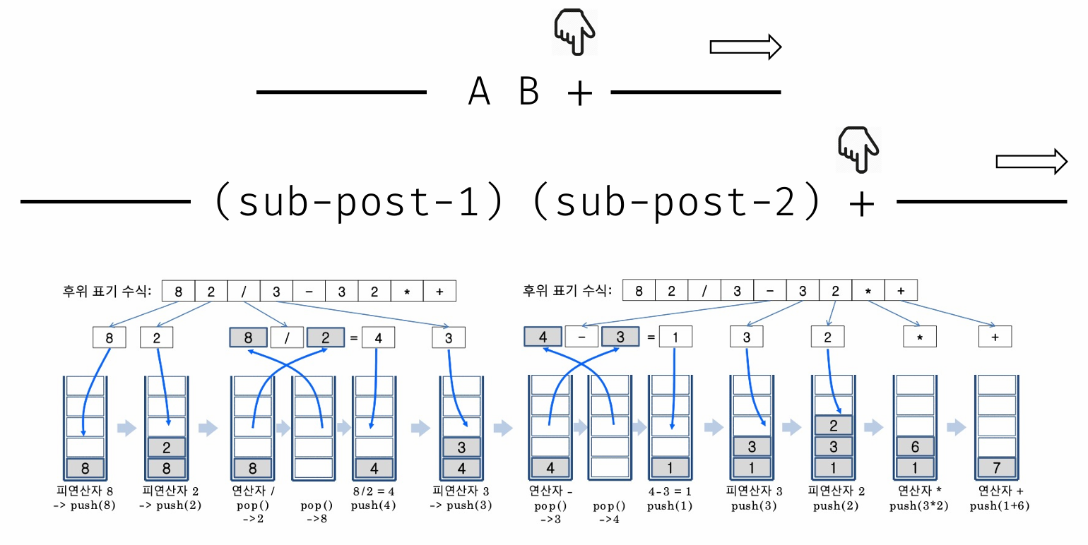 - 가장 마지막으로 등장한 피연산자 (결과값)을 파악하기 위해 스택을 활용!