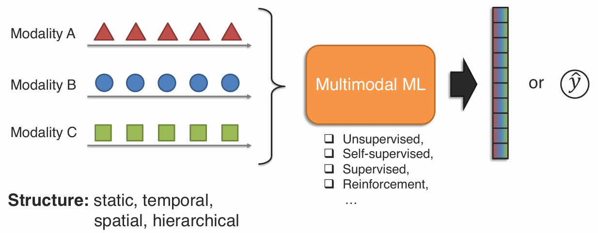 멀티모달은 사전적인 의미로, 다중 모달리티이지만, 연구 관점에서는 heterogeneous (이질적인) 와 interconnected (상호연결된) data 의 과학이다. 즉, 이질적인 모달리티를 상호 연결시키는 관점으로 보면 되겠다.
