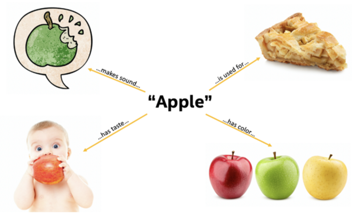 사과라는 단어가 머리에 각인되기 전에 이미 사과를 맛보고, 그 생김새와 색깔, 크기, 그리고 시큼하면서도 달콤한 맛, 까끌 거리면서도 매끈한 촉감을 알게 된다. 그리고 비슷한 모양의 청사과 풋사과, 잘 익은 사과, 상하거나 멍든 사과까지 여러 종류의 사과를 알게 되고 나서는 그것을 묶어서 '사과(Apple)'라는 개념으로 뇌에 통합해서 저장하게 된다.
