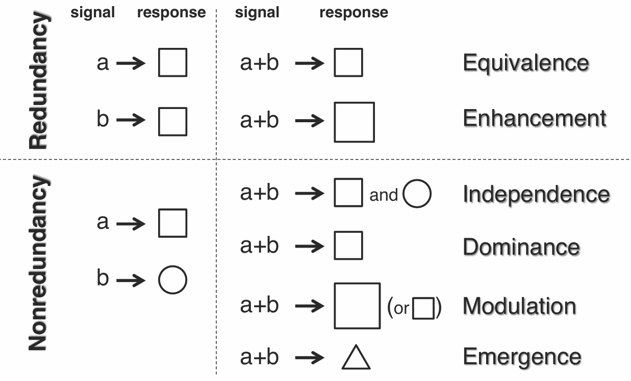 - Enhancement (강화) : 신호 a, b 가 함께 작용하여 결과를 강화함. 개별 신호도 결과를 생성하지만, 함께 사용하면 더 강력한 결과를 얻을 수 있음