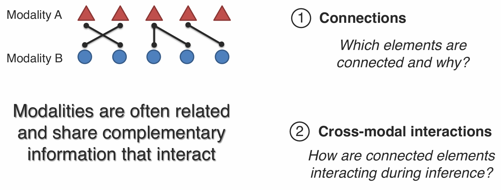 - 정의 : 여러 모달리티의 모든 요소들 간의 cross-modal connections 을 식별하고 모델링하는 것